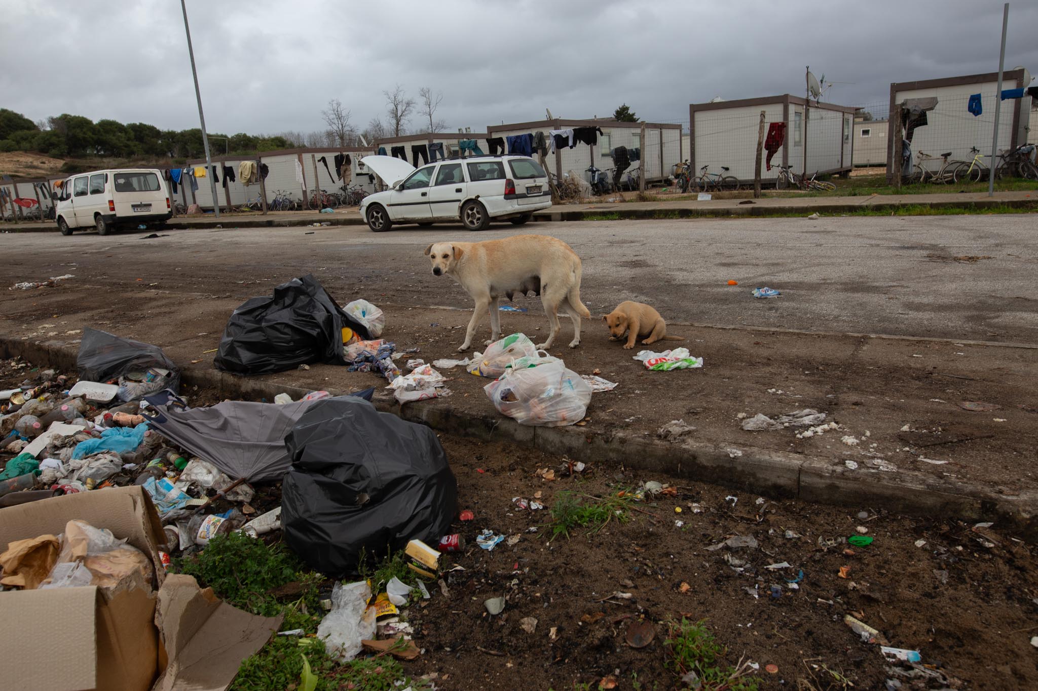 Una cagna con il suo cucciolo nella baraccopoli di San Ferdinando RC